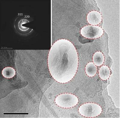 高速靶向射击的纳米碳管中所形成的纳米金刚石的TEM图,内嵌图为纳米结构的衍射图